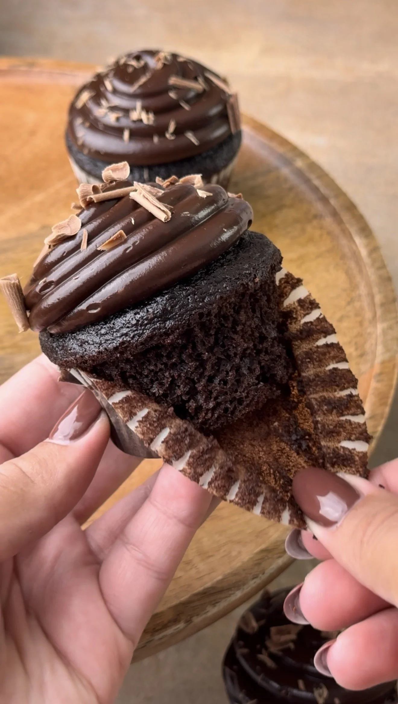 - Using a piping bag and a round piping tip pipe ganache swirls on the cupcake.