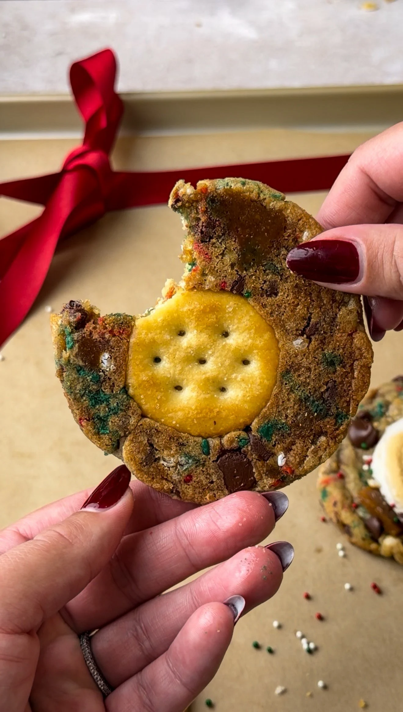 - Add a few more chocolate chips, some toffee and sprinkle more sprinkles on the cookies.