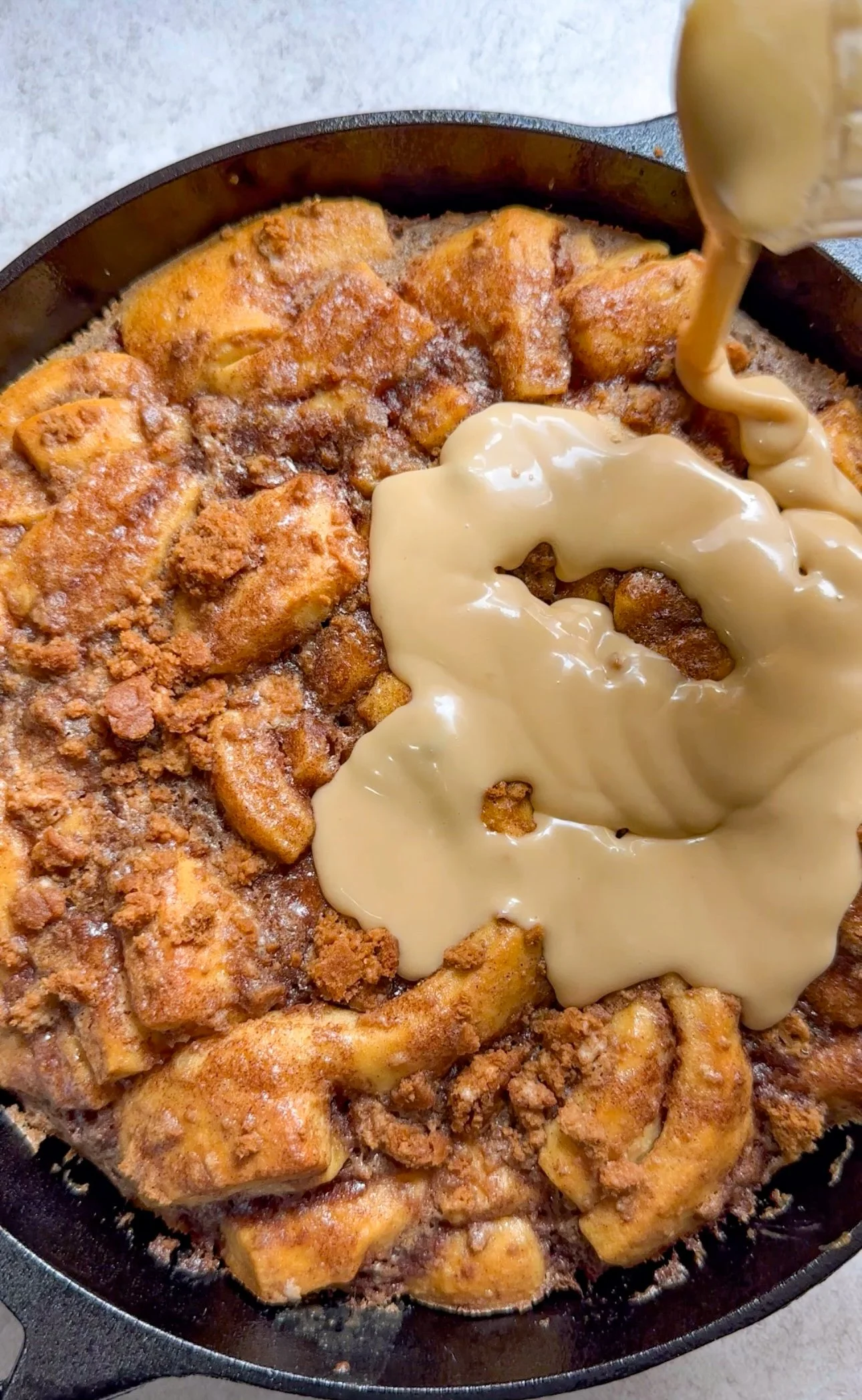 - Once the biscoff spread is runny pour it over the glaze on top of the cinnamon rolls.
