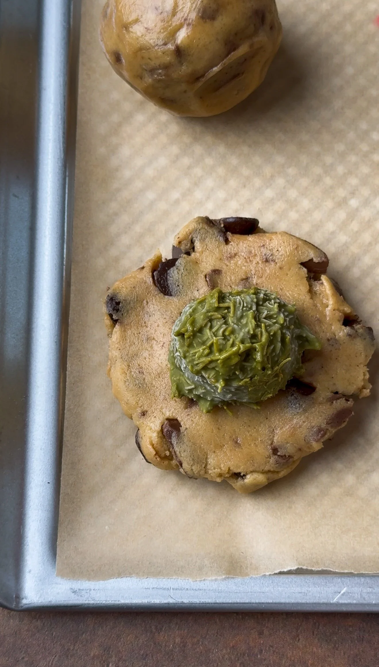 - Drop the dough balls by 1/3 cup or use a regular size ice cream scoop. Flatten the cookie dough with the palm of your hand right on the parchment paper and place a dallop of pistachio kataifi in the center of the flattened cookie dough.