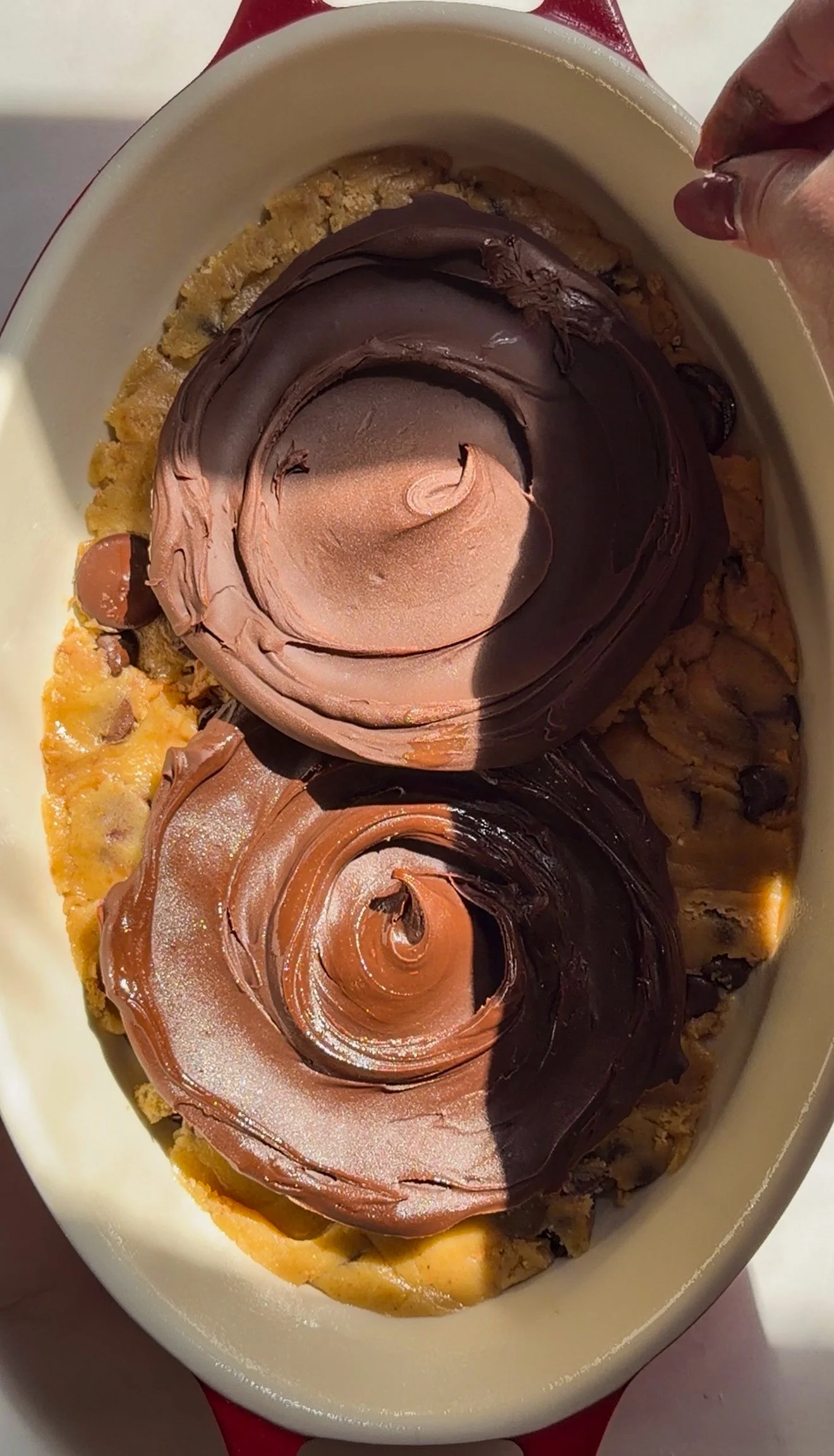 - Carefully add the frozen nutella dallops on the top center of the cookie dough in the skillet.